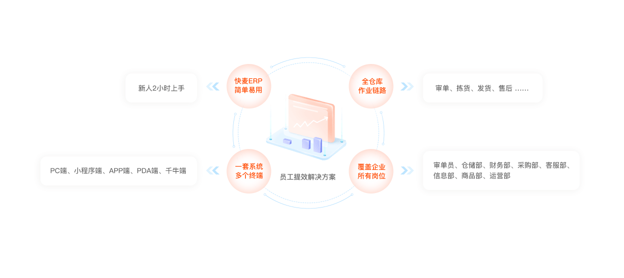 • 快麥ERP覆蓋全部門、全流程、全終端,實(shí)現(xiàn)企業(yè)系統(tǒng)化管理,幫助員工提升效率